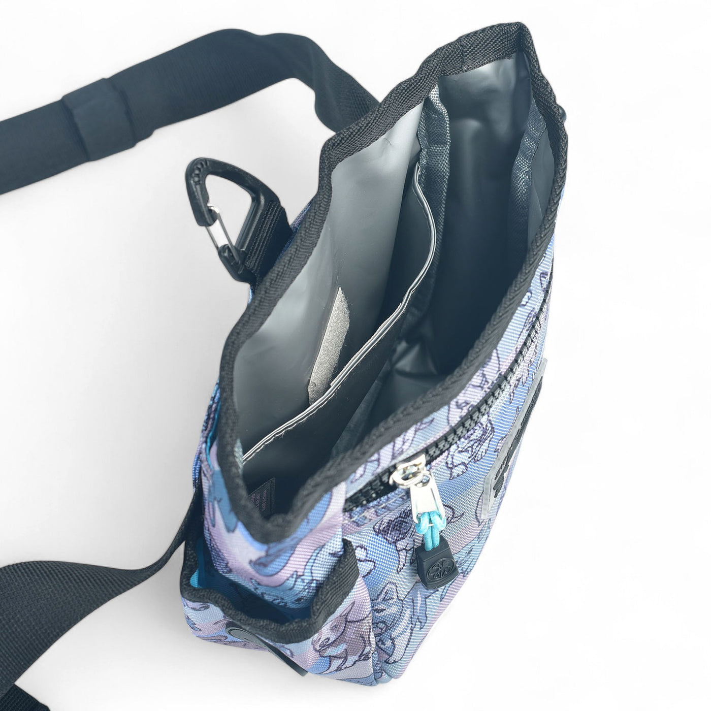 • The main compartment has a magnetic closure and an inside divider with a velcro closure for separating high reward treats. Lined with easy clean, insulating vinyl like you would find inside of a cool bag.