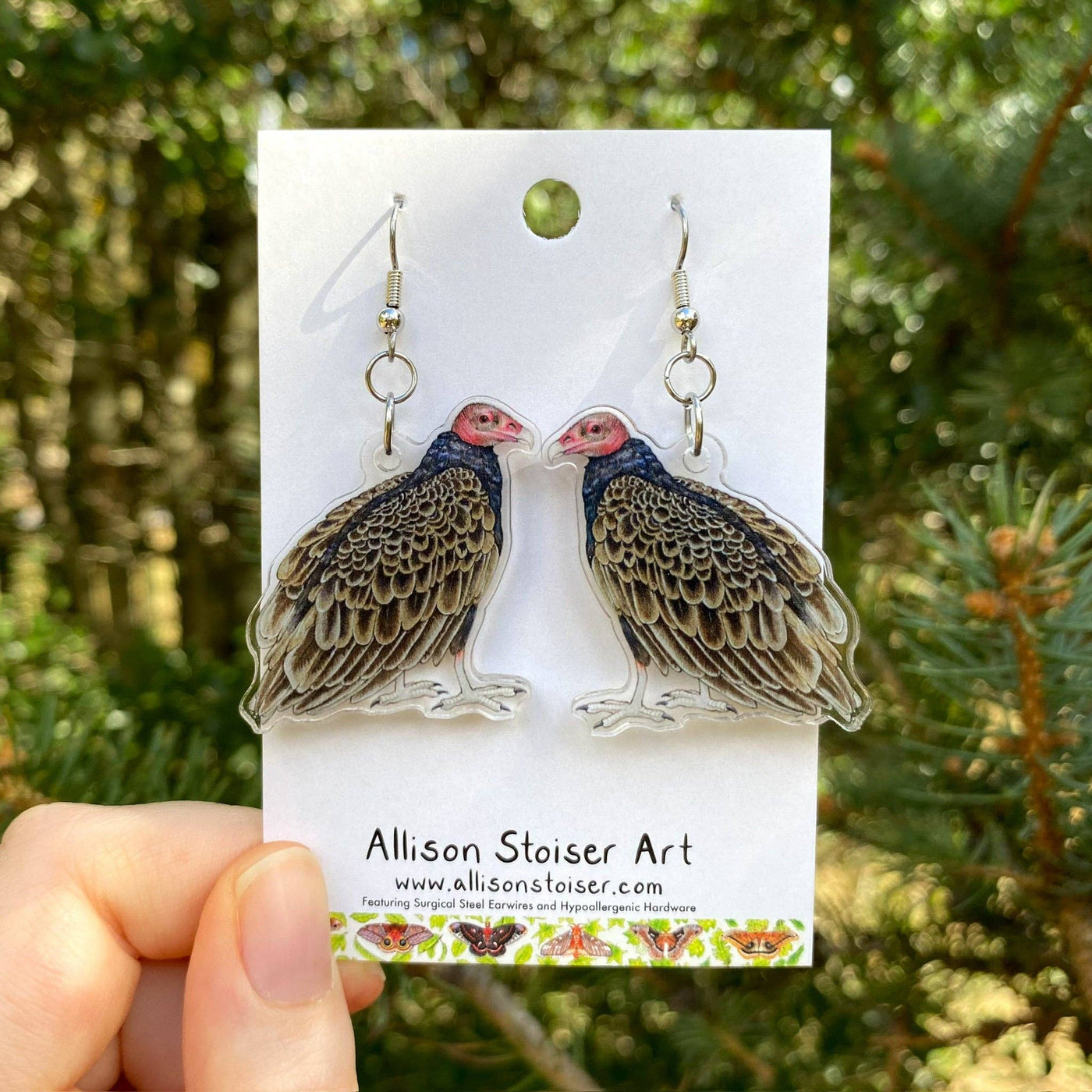 These double-sided, lightweight acrylic earrings feature artist Allison Stoiser's illustration of a turkey vulture. Perfect for lovers of wildlife art, scavengers, and raptors!