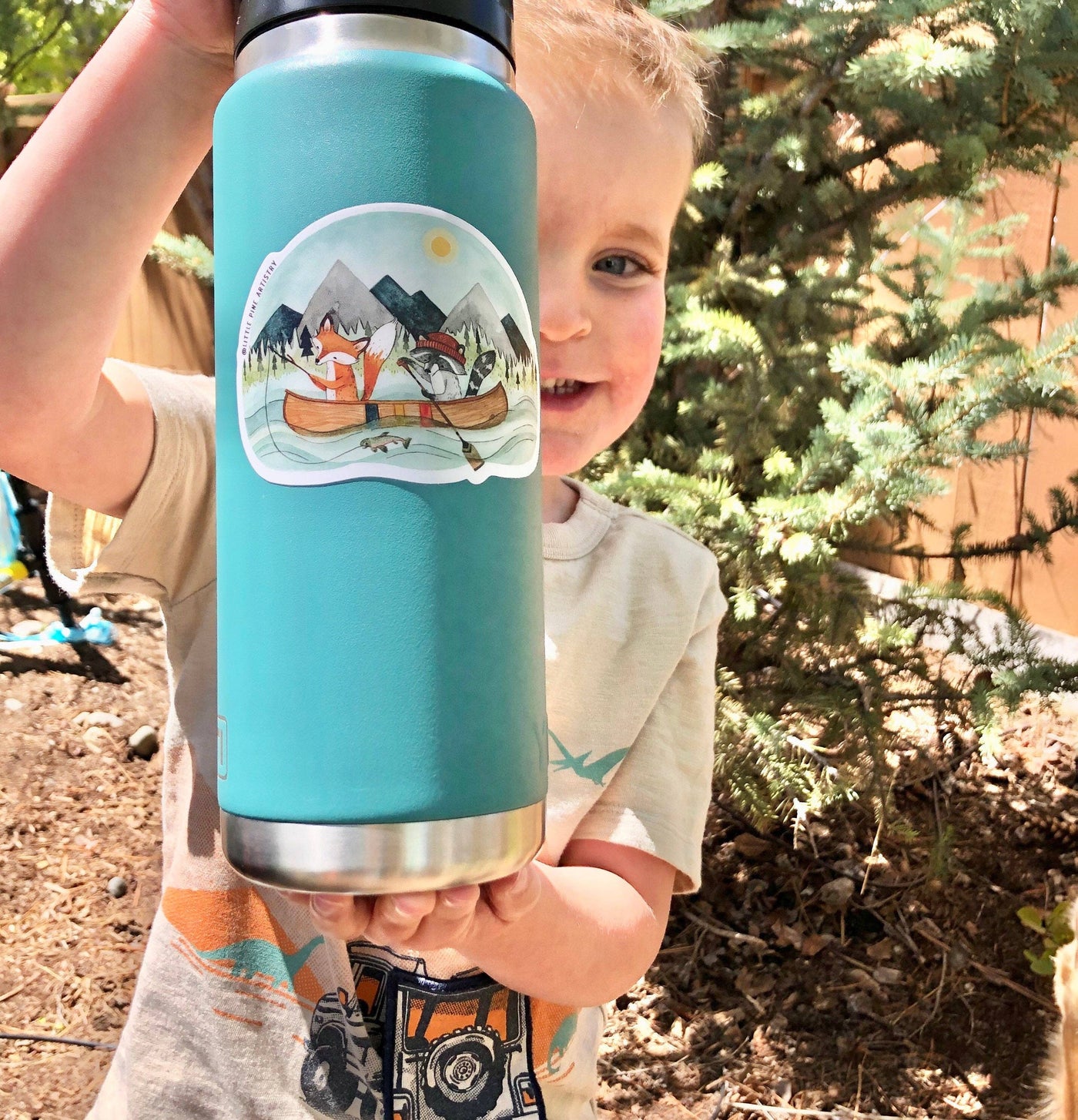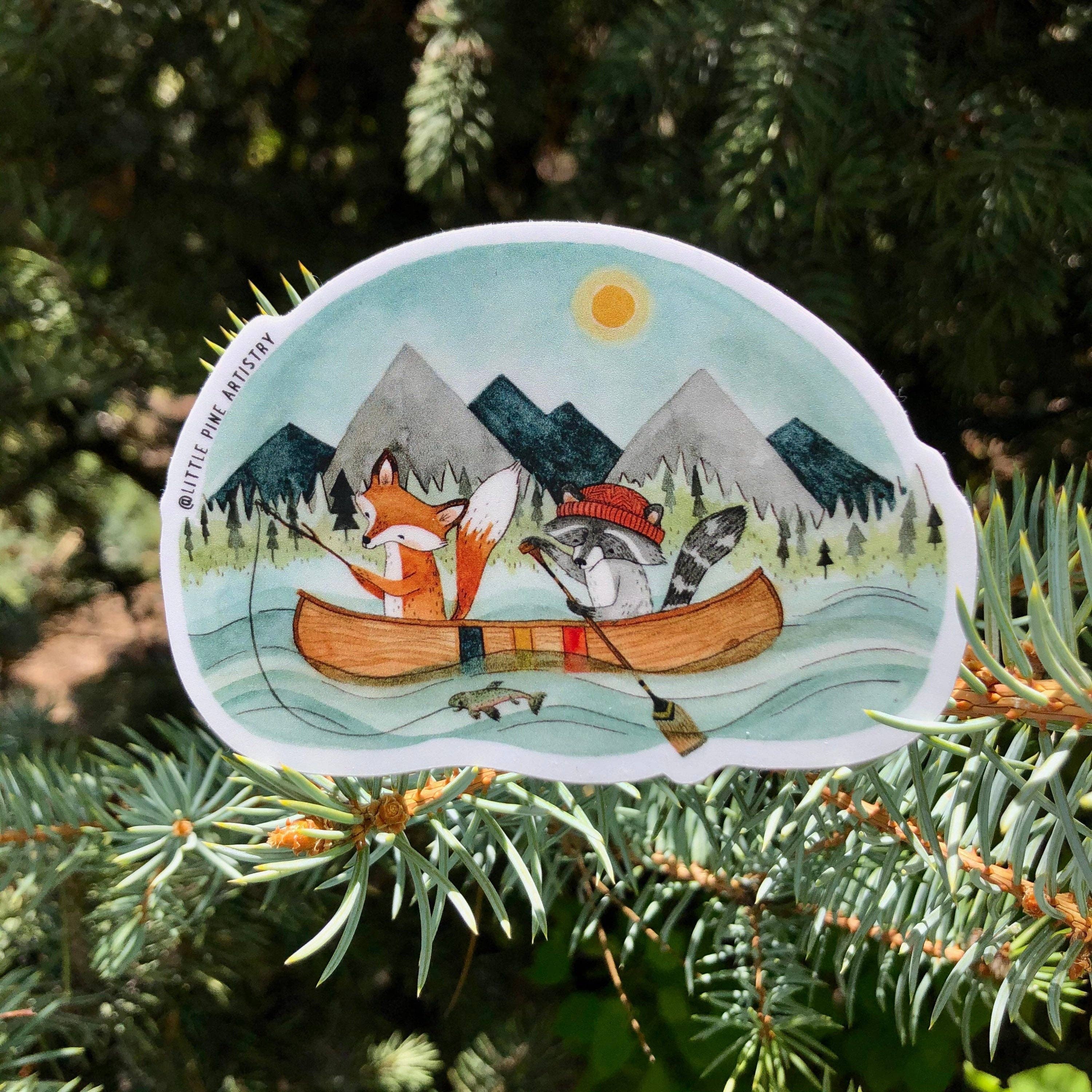 This Canoe Adventure sticker is based on Canyon & Cove's original watercolor painting that portrays a whimsical scene of fox and raccoon friends fishing in lake with a mountain backdrop. It would be a great fit on a coffee water bottle or tackle box.