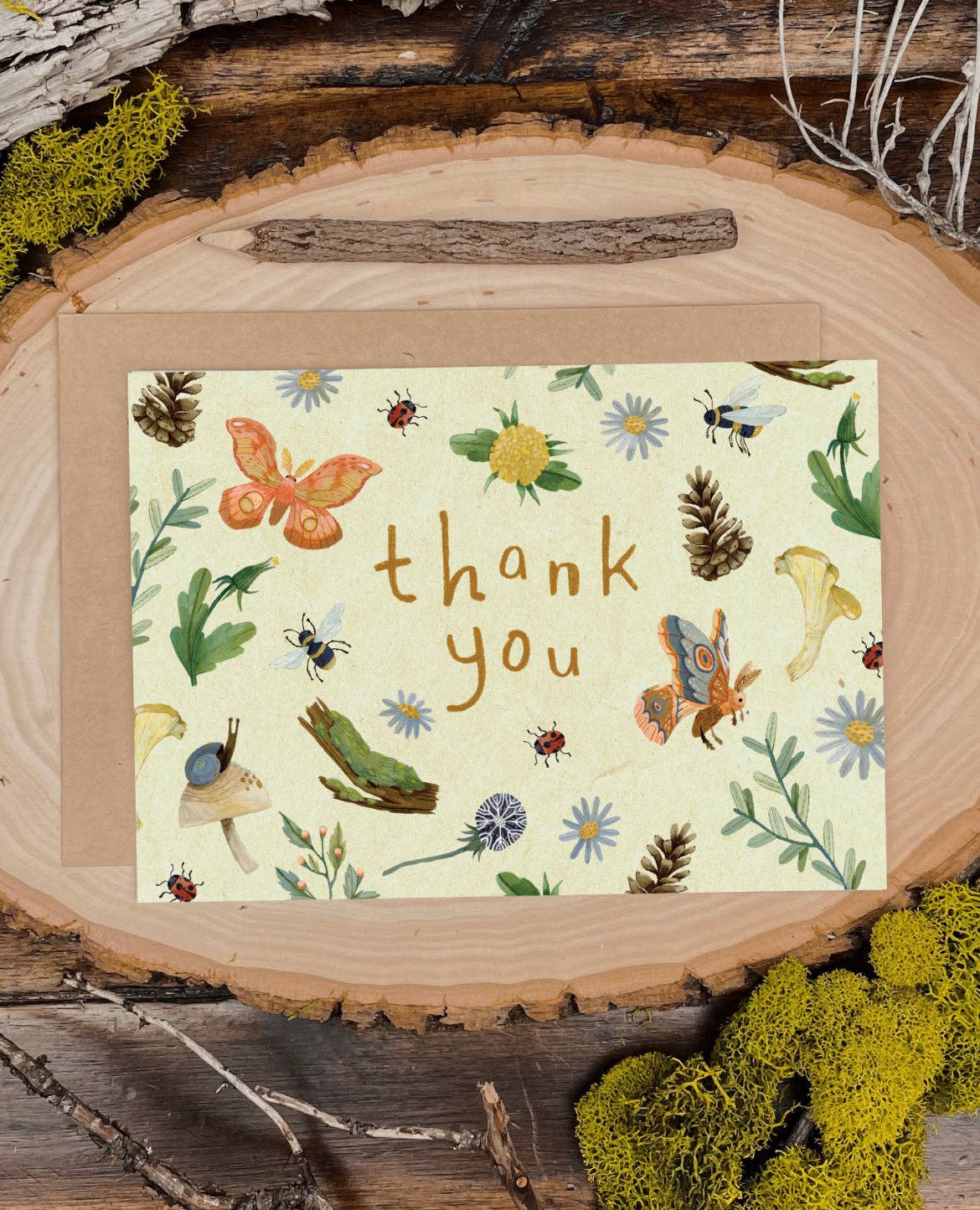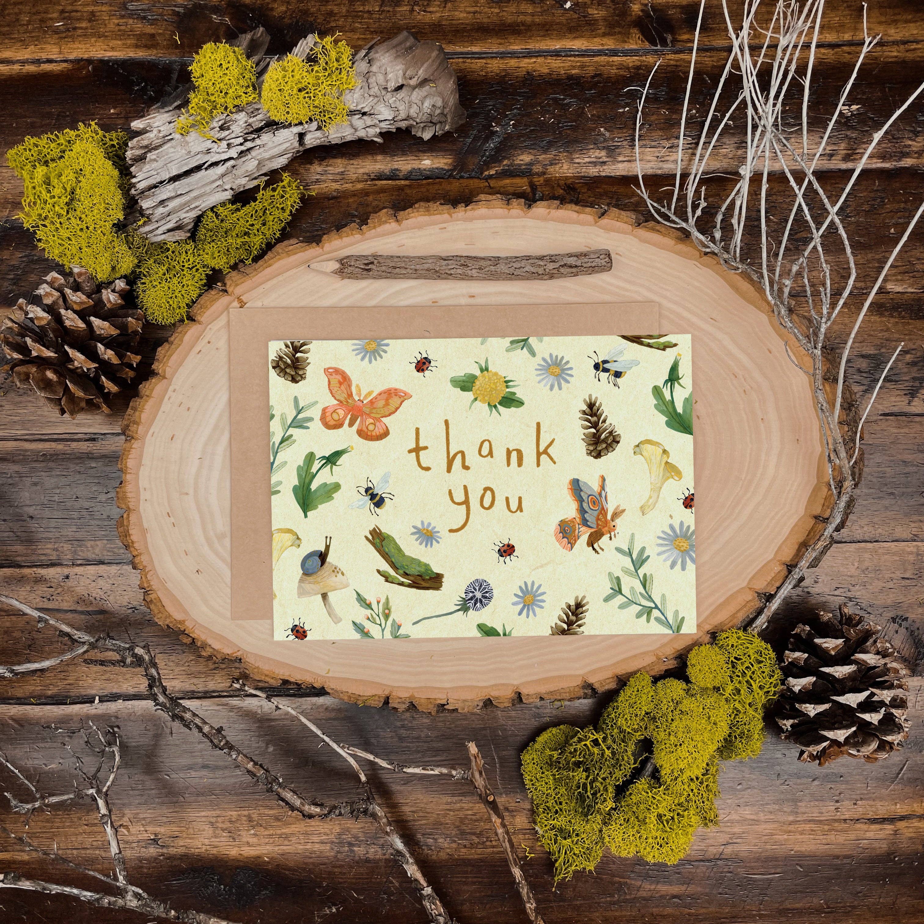The Fauna and Flora Thank You Card features whimsical flowers, honey bees, ladybugs, butterflies, mushrooms, and pinecones on a soft background and a simple “Thank You” written on the front. A sweet card to give to anyone deserving of some thanks from you.  Reproduction of Canyon & Cove's original artwork using a combination of watercolor and/or gouache paints and colored pencils.