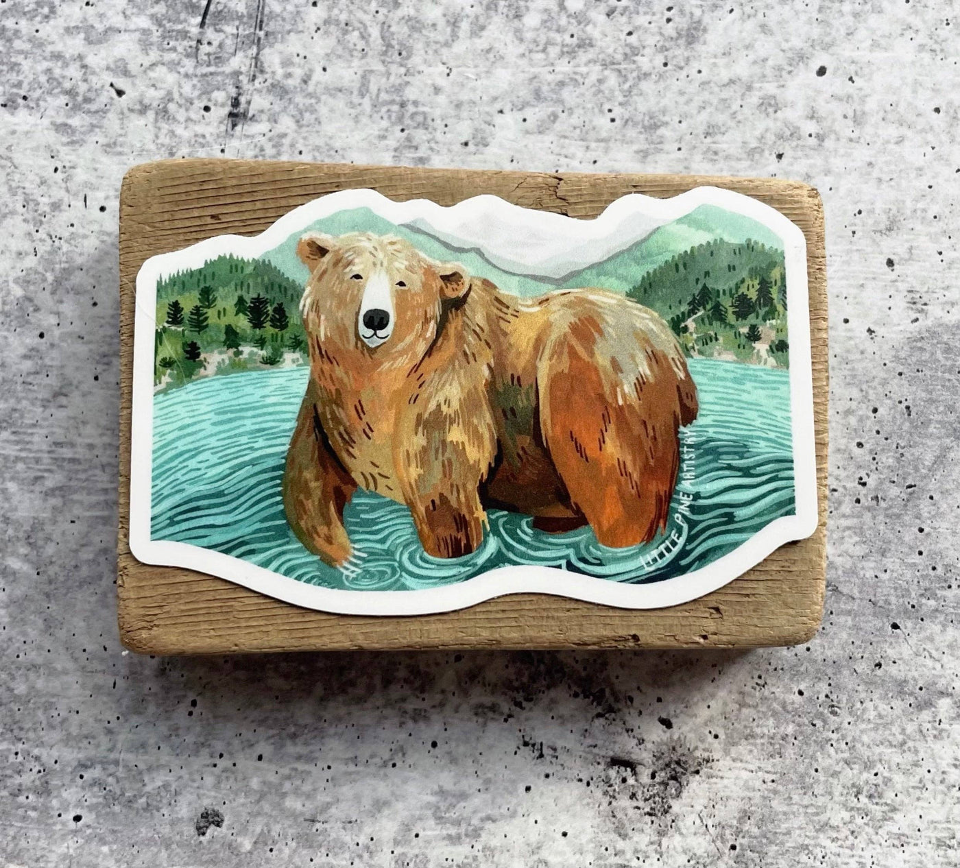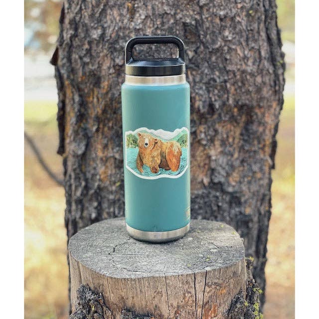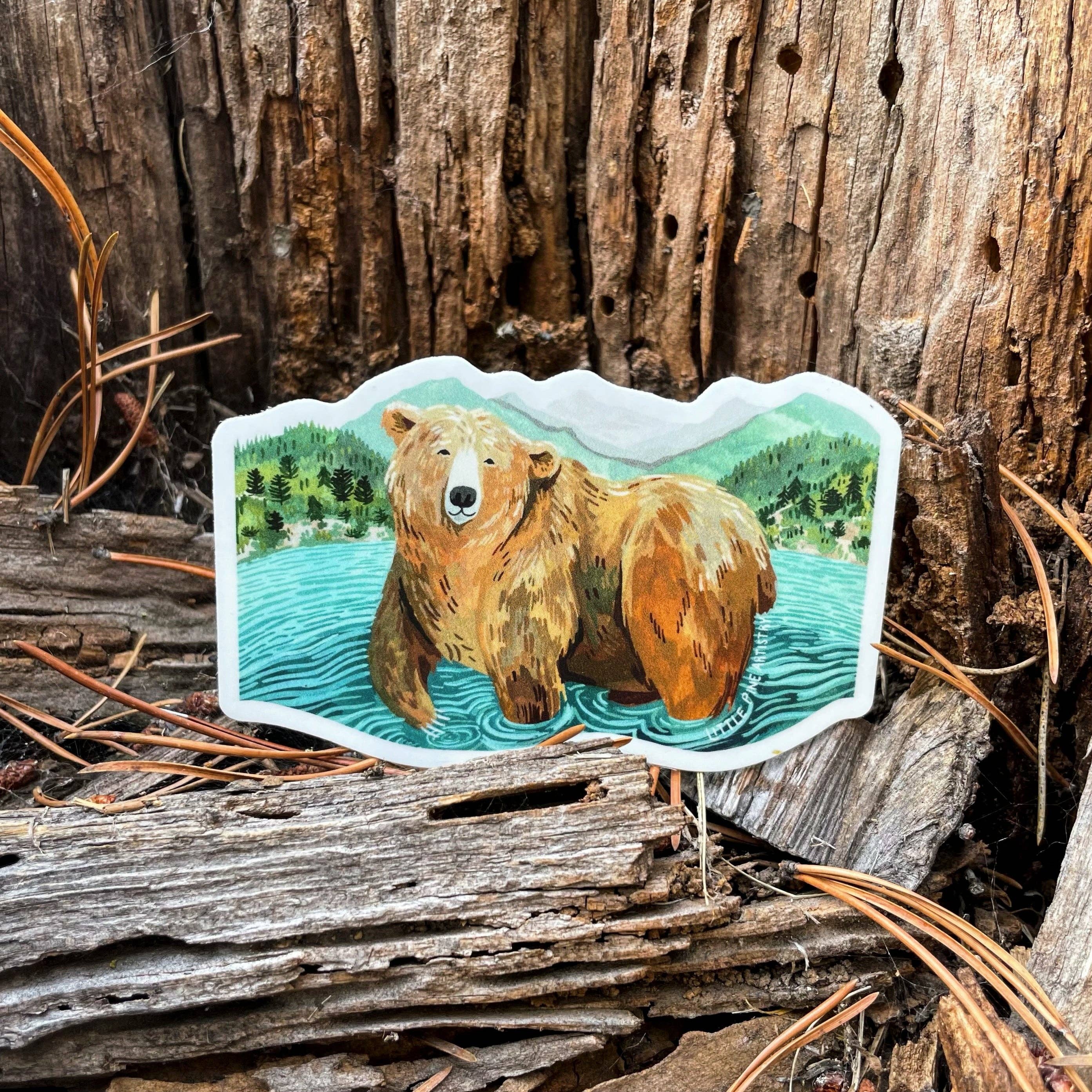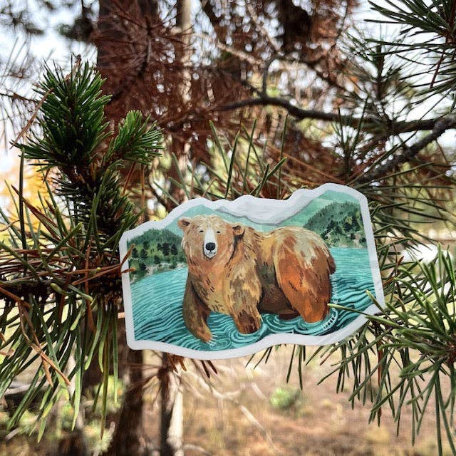 Glacier Grizzly sticker is a reproduction of Canyon & Cove's original gouache painting of a grizzly bear wading in Lake McDonald in Glacier National Park.