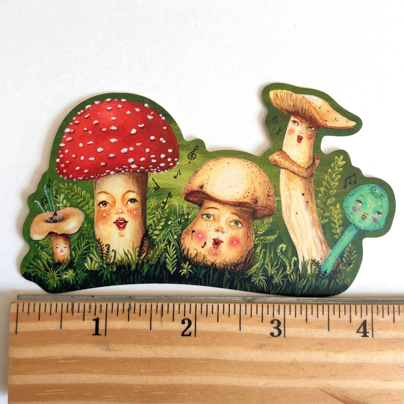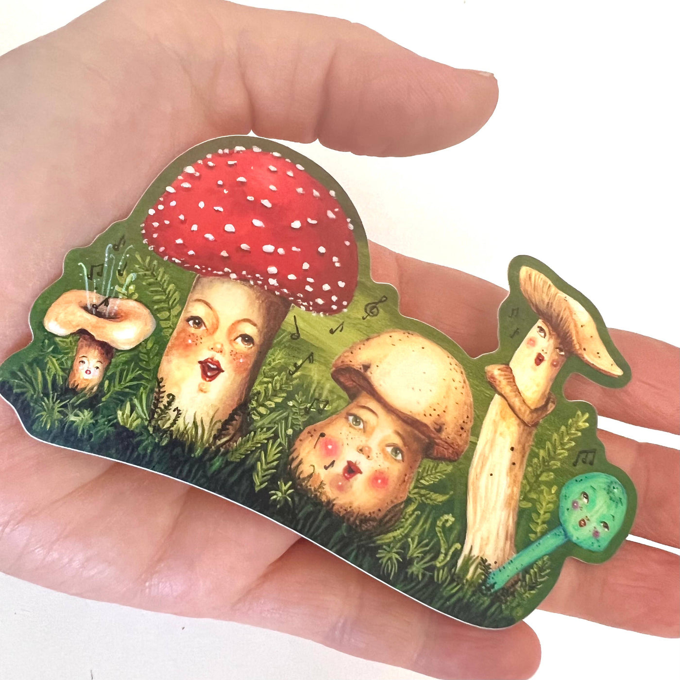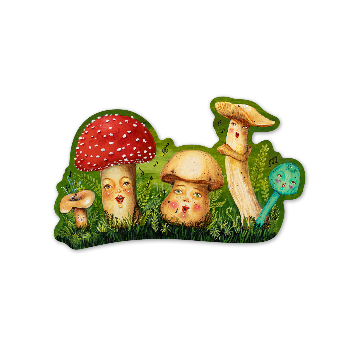 A vinyl sticker featuring the singing mushrooms from artist Jahna Vashti's "Shroom Tunes" painting.