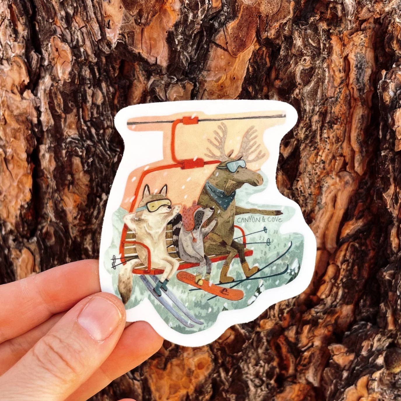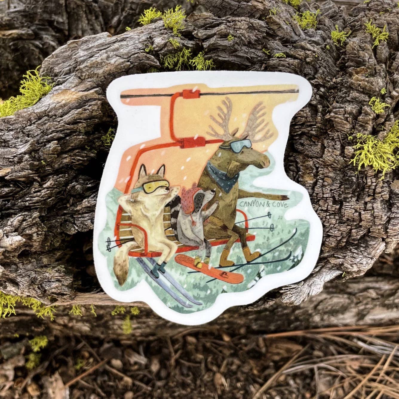 Wolf, raccoon and moose friends ready for some skiing.