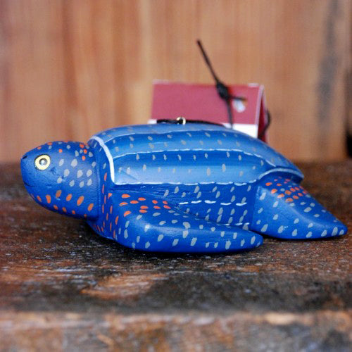 Unique, lightweight Leatherback Sea Turtle ornament created by artisans on Isla Solentiname, Nicaragua. Each ornament is inspired by nature, carefully hand-carved with a machete and painted with realistic detail. Approximate size of each ornament is 5" x 2". Materials: Sustainably harvested balsa wood and non-toxic acrylic paint.