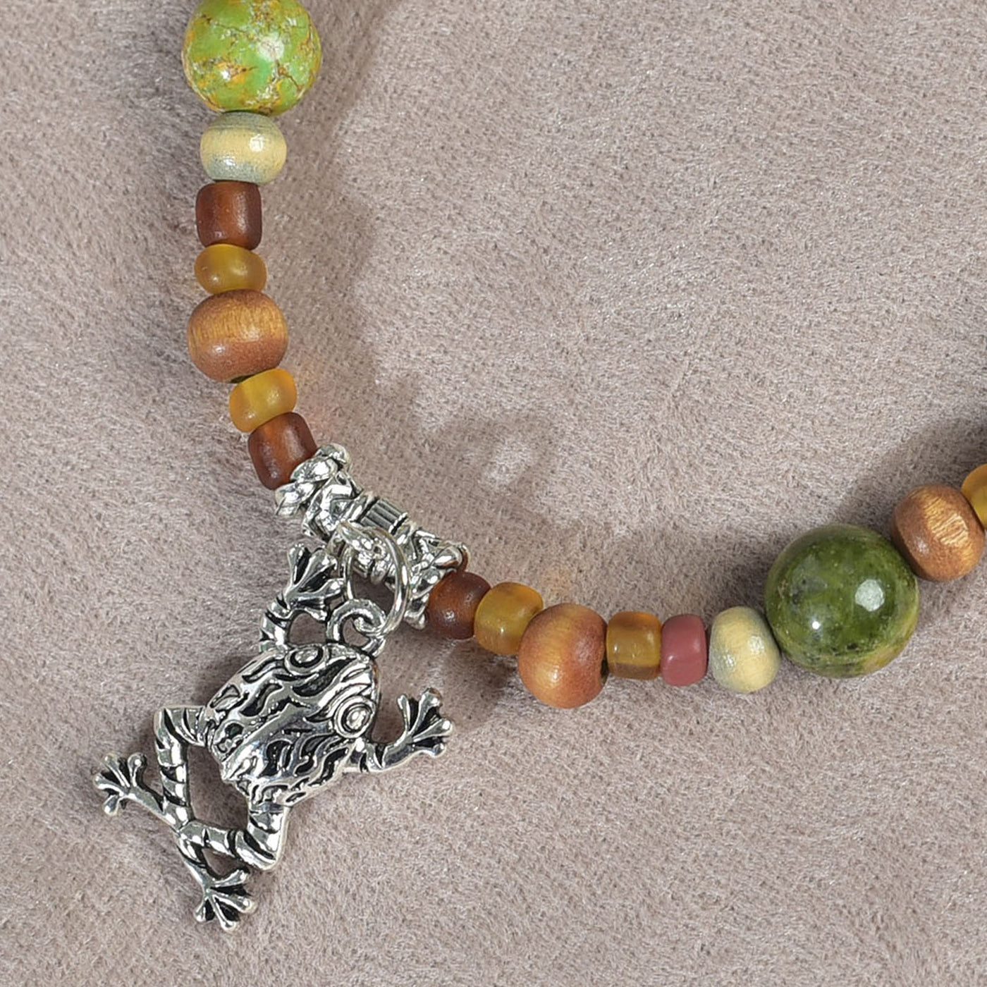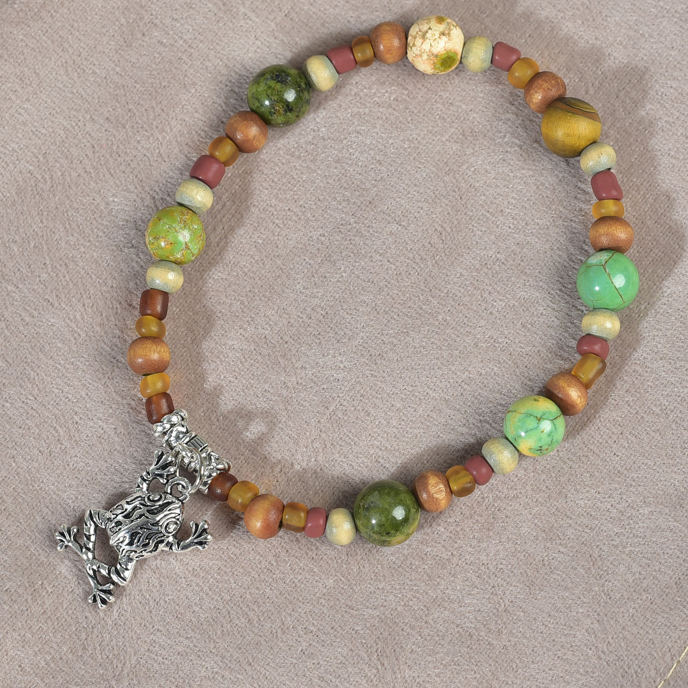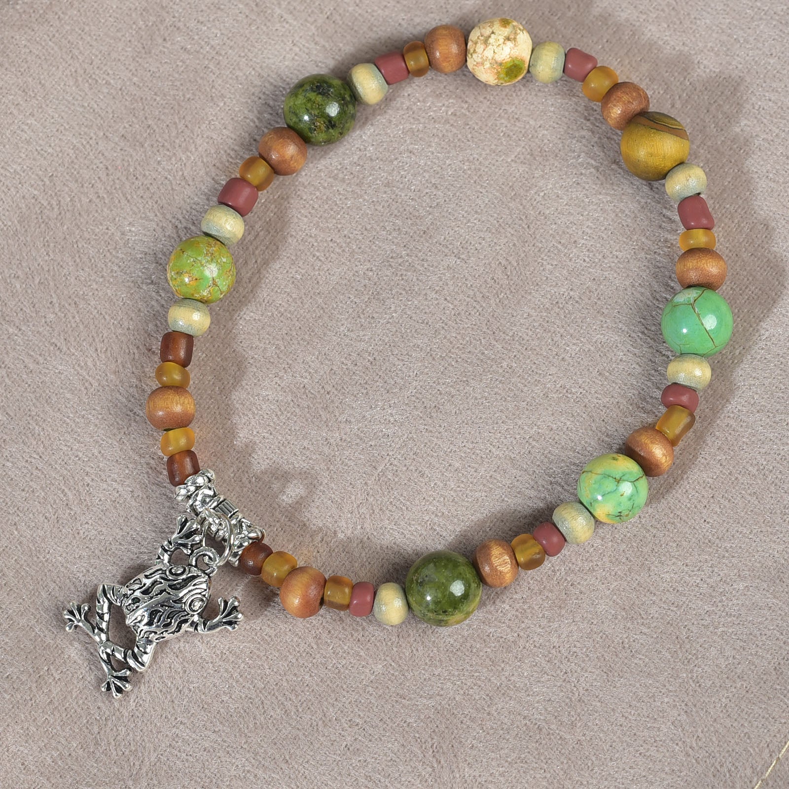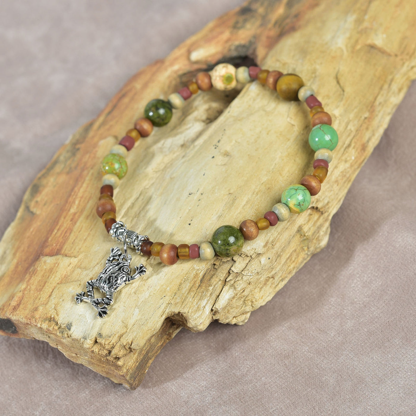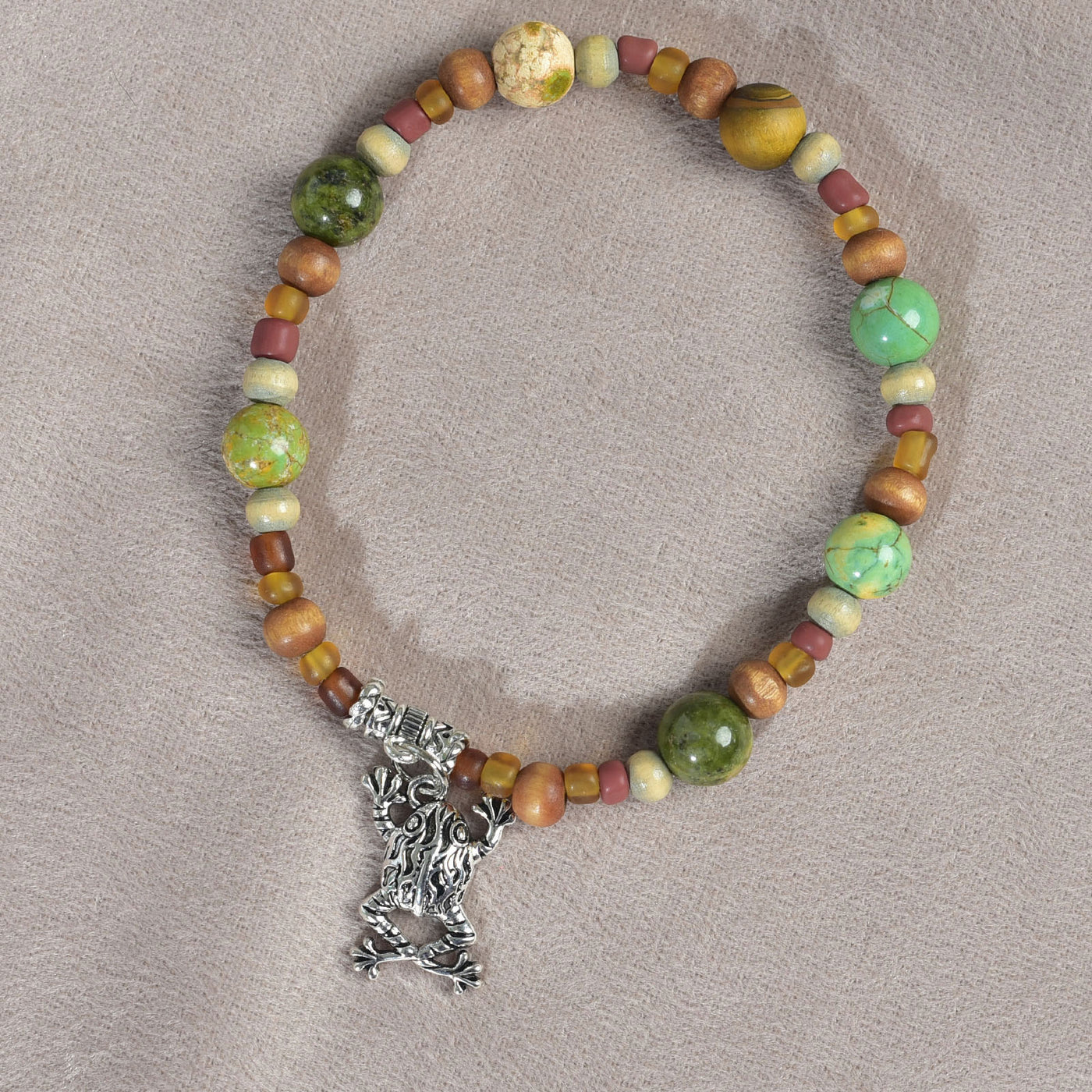Each bracelet is thoughtfully handcrafted on durable stretch cord and finished with nature-inspired charms and carefully curated bead colors. Materials: Acrylic & wood beads, metal charm, durable stretch elastic cord.