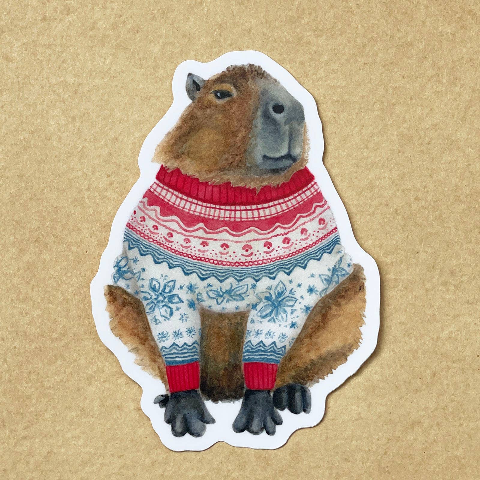 A very sweet and cozy capybara in a festive holiday sweater! Perfect for decorating that hot chocolate thermos! Each vinyl sticker is super durable and is sun, water and even dishwasher resistant! Actual size: 2.5 x 3.5 inches.
