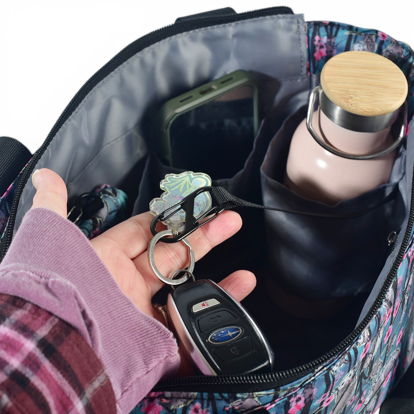 Whether you're on your daily routine, heading to the office, running errands, or embarking on your next journey, this versatile medium tote bag is ready for it all. Crafted from eco-friendly recycled materials, it features stunning, nature-inspired prints that make every trip feel like a journey into the wild. With multiple organizational pockets and a handy key clip, staying organized has never been easier. The spacious interior is perfect for carrying your daily essentials, while the sturdy design ensures it's built to withstand all of life's adventures. Ready for wherever your day takes you!
