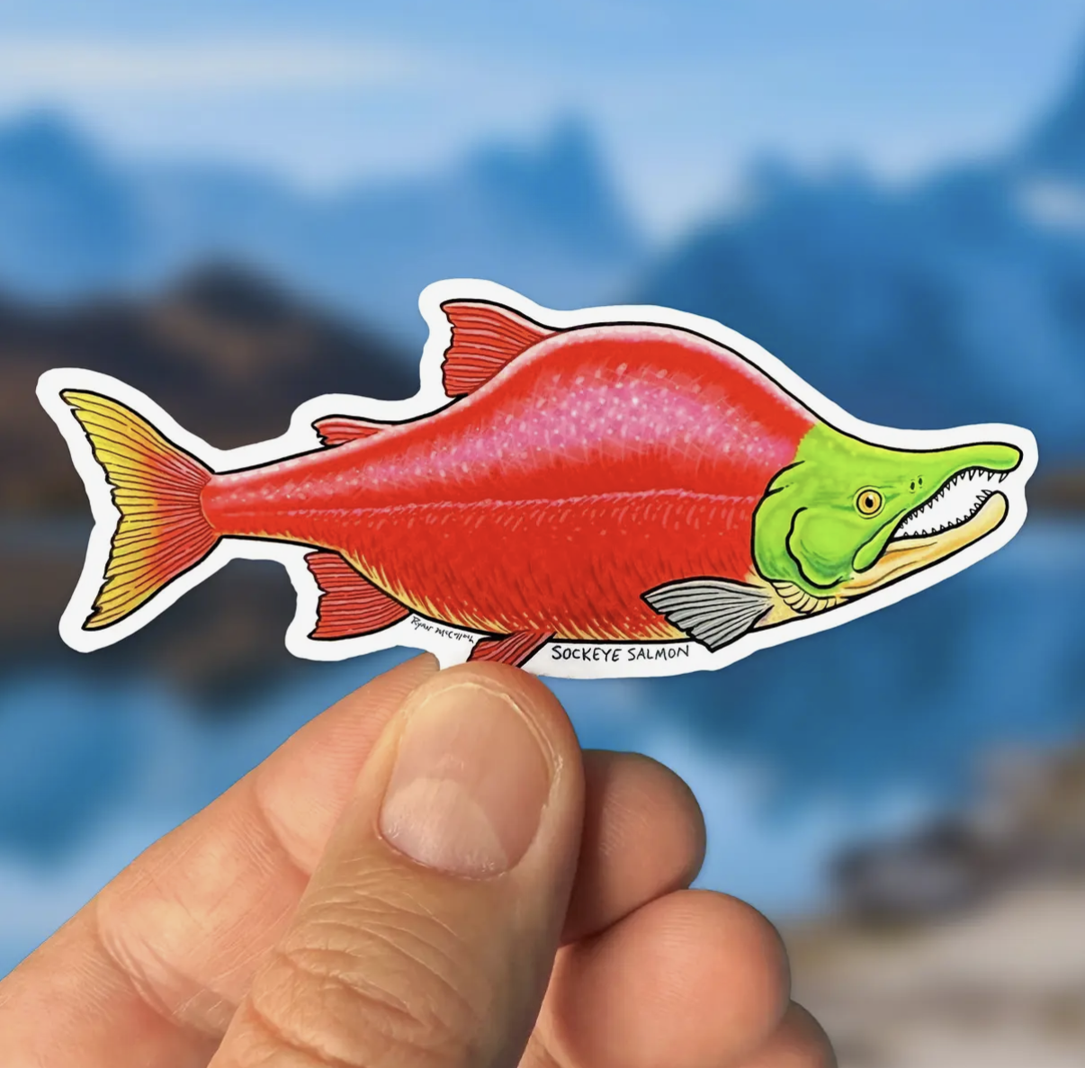 Brightly colored sockeye salmon vinyl sticker. All of Ryan McCulloch Arts' premium vinyl stickers are durable, waterproof, U.V. protected, and professionally printed.