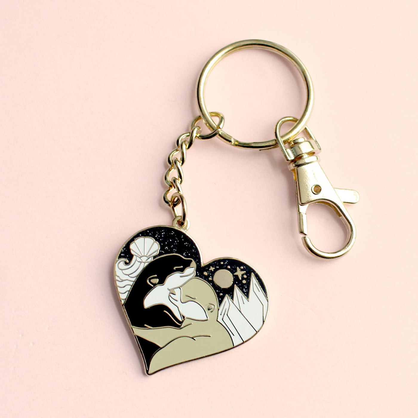 Express your love of all things otter with this in-love pair! This 35mm gold hard enamel keychain features two hugging otters, with mountains and the sea in the background and a black glitter sky.