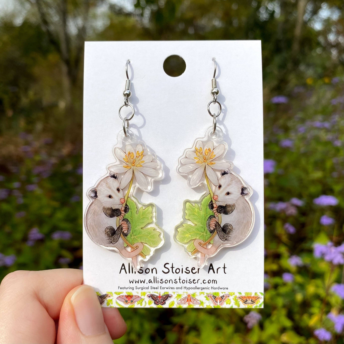 These double-sided, lightweight acrylic earrings feature artist Allison Stoiser's illustration of a tiny opossum clinging to a bloodroot stem.