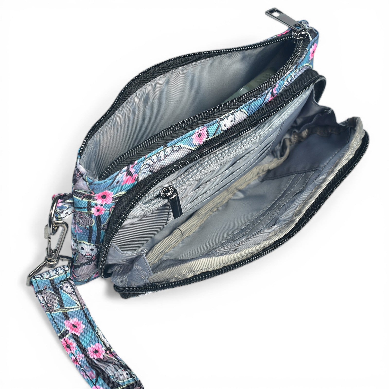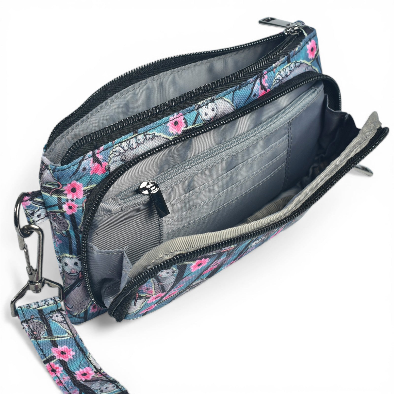 The wallet compartment includes 6 designated card slots, a zipper change compartment and a cash or receipts sleeve. The larger zippered compartment fits a passport and most smart phones.