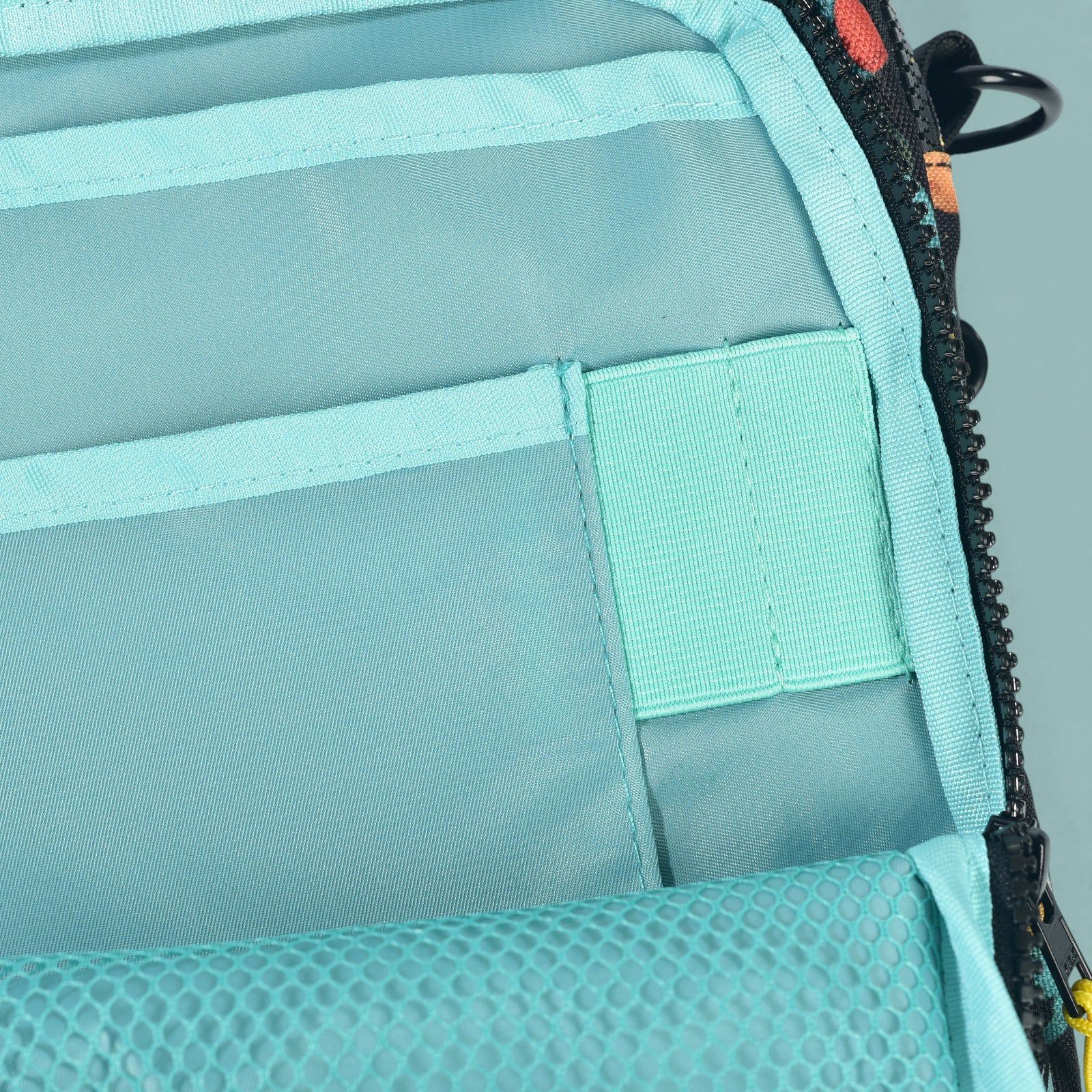 • Front pocket with 2 open pockets, a zippered mesh pocket and 2 pen slots plus a key clip.