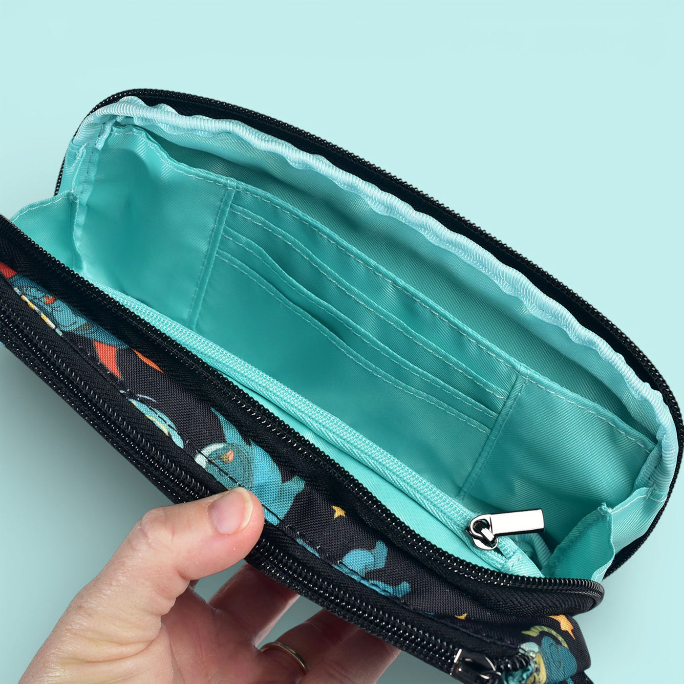• 6 designated card slots, zippered change compartment, cash sleeve