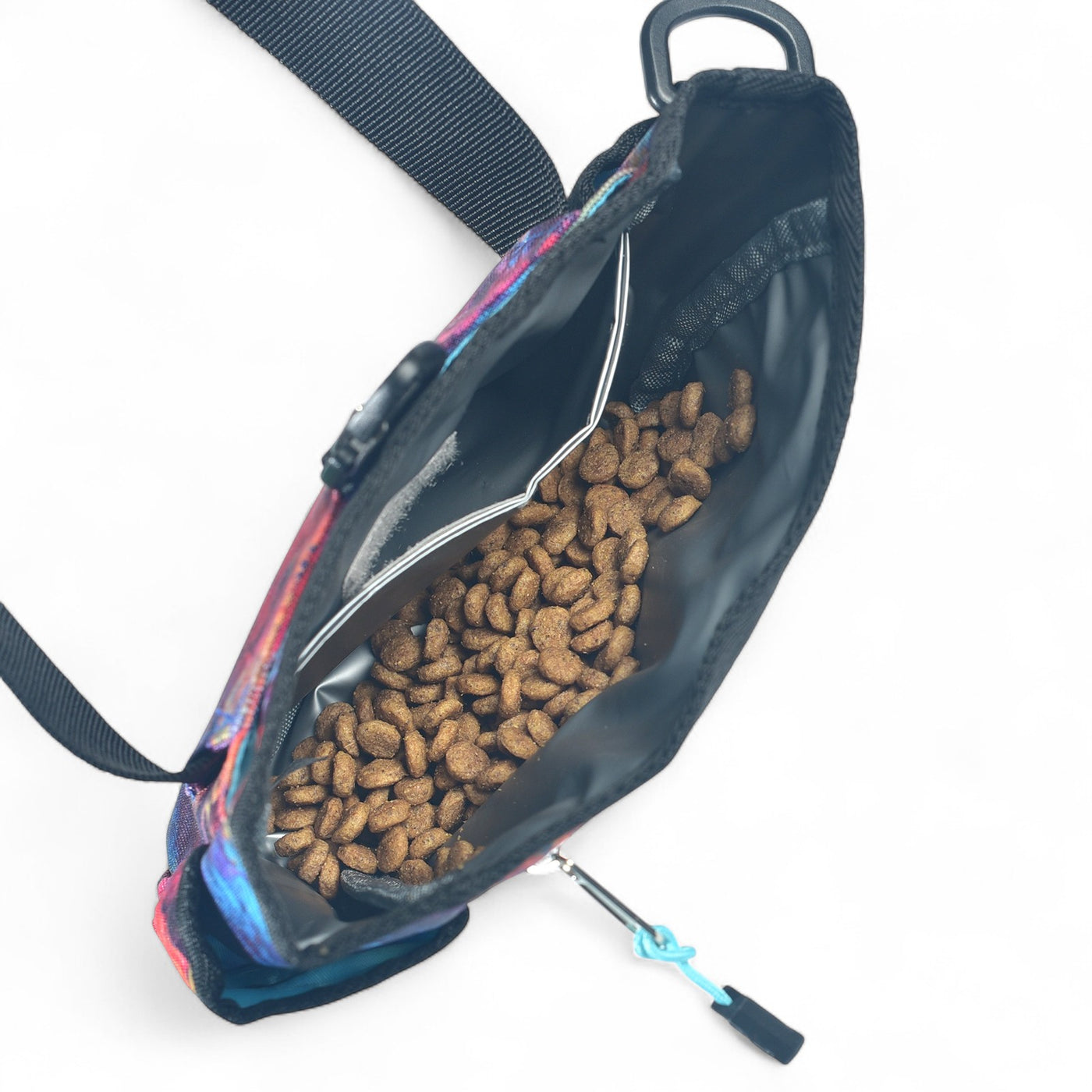 • The main compartment has a magnetic closure and an inside divider with a velcro closure for separating high reward treats. Lined with easy clean, insulating vinyl like you would find inside of a cool bag.